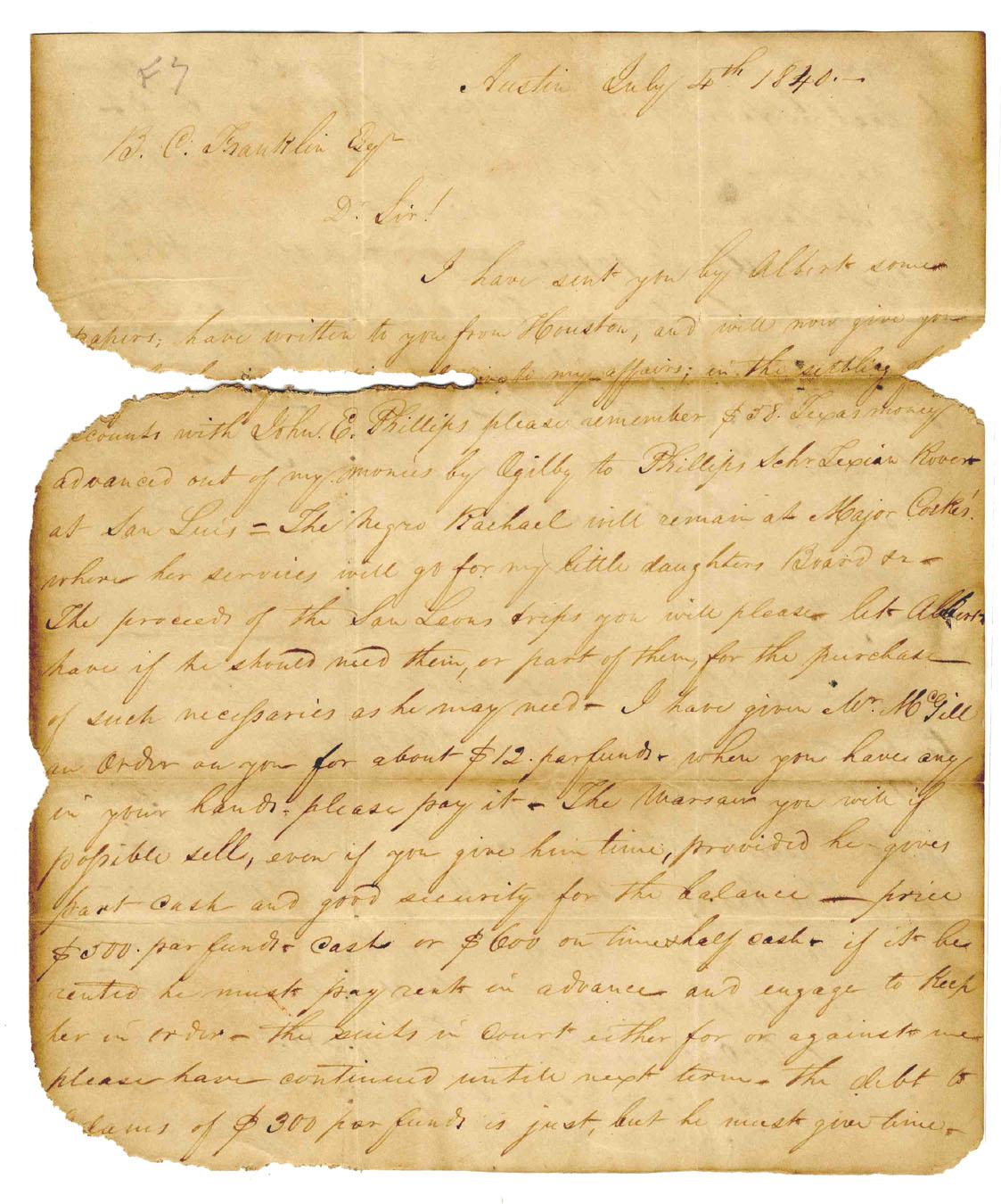 3pp. Texas Republic letter datelined Austin, 4 July 1840. From Dr. C.F. Worcester to attorney B.C. Franklin of Galveston, Texas. In part: ''…Indians are almost under our very eyes stealing horses. A Negro woman…was a night ago shot and scalped. Last night they came to the camp of the Pitkin Guard, but were run off…We have as yet no arms. All are…eager for the fray…'' Paper loss and heavy toning and wear, though letter remains in readable condition. Several lines of writing missing. Letter measures 8'' x 9.5''.