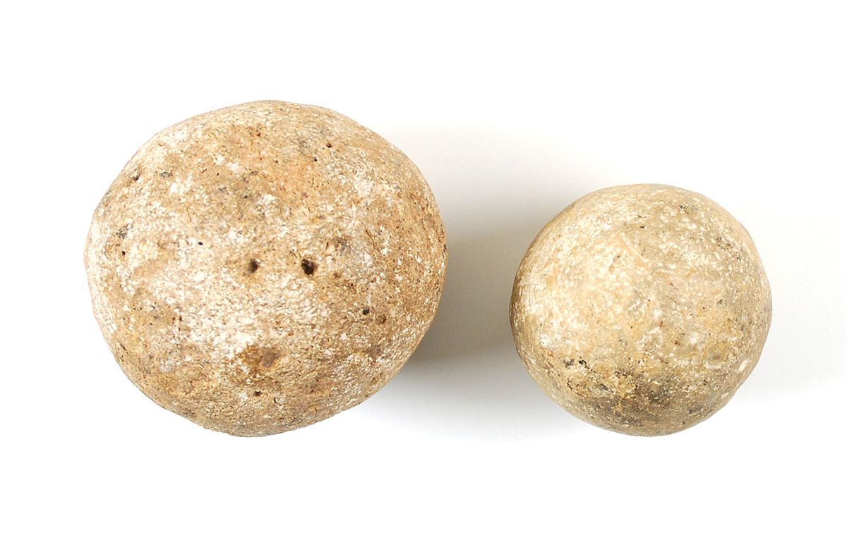 Historic pairing of two Texas Revolution–era cannonballs originating from the family of Asa Mitchell, an early settler who participated in the Texas Revolution throughout its entirety. The larger cannonball measures 4? in diameter and weighs 3 pounds 5.6 ounces, and the smaller cannonball measures 3? in diameter and weighs 1 pound 7.2 ounces. The cannonballs exhibit general expected pitting and wear. After moving to Texas in 1822 and settling at the mouth of the Brazos River, Asa Mitchell established himself as a successful merchant, farmer, and stock raiser. He joined an early faction of supporters of Texan independence, and was one of the 112 who resisted Mexican oppression in the Battle of Velasco in 1832, the first true military conflict between Mexico and settlers in Texas. He also fought under Sam Houston in the decisive battle of the Texas Revolution in 1836, when the the Texian Army engaged and defeated General Santa Anna’s Mexican forces.