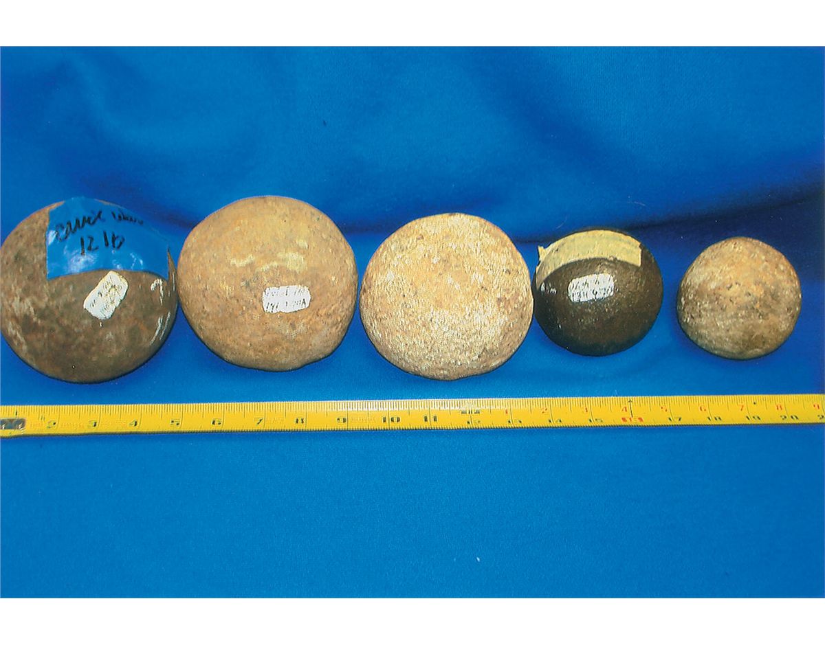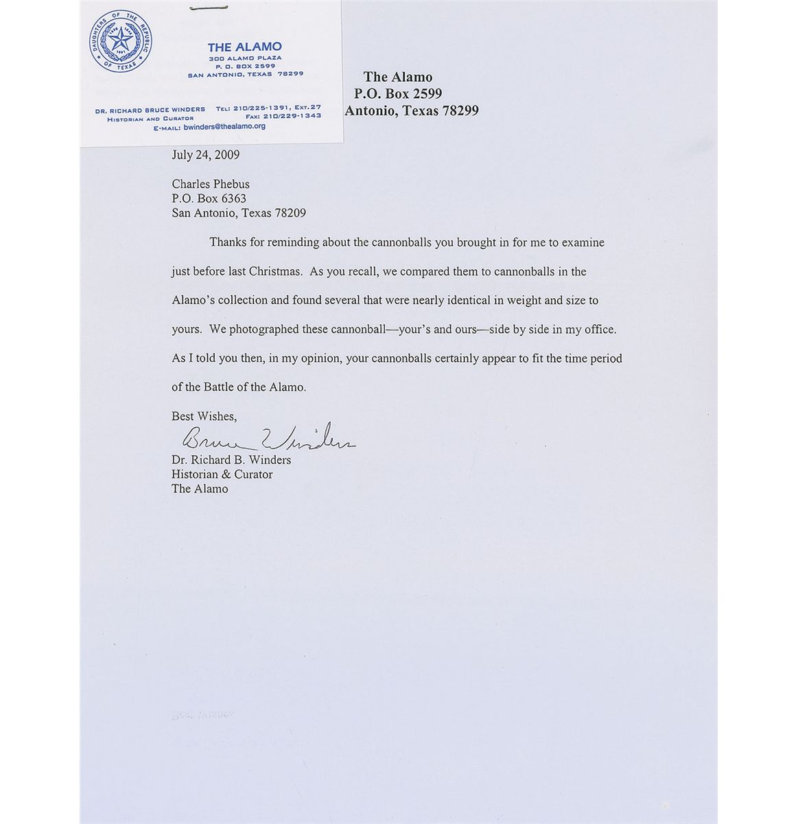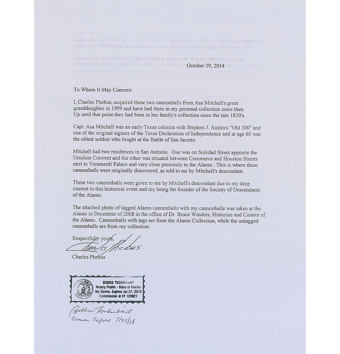 Includes a notarized affidavit from the consignor, in part: “I...acquired these two cannonballs from Asa Mitchell’s great-granddaughter in 1999...Up until that point they had been in her family’s collection since the late 1830s. Capt. Asa Mitchell was an early Texas colonist with Stephen F. Austin's 'Old 300' and one of the original signers of the Texas Declaration of Independence and at age 60 was the oldest soldier who fought at the Battle of San Jacinto. Mitchell had two residences in San Antonio. One was on Soledad Street opposite the Ursuline Convent and the other was…between Commerce and Houston Streets next to Veramerdi Palace (in very close proximity to the Alamo). This is where these cannonballs were originally discovered.” Also accompanied by a photo of these two cannonballs next to nearly identical examples held in the collection of the Alamo, as well as a letter from the Alamo's historian and curator Dr. Richard B. Winders, in part: "We compared them to cannonballs in the Alamo's collection and found several that were nearly identical in weight and size to yours. We photographed these cannonballs—yours and ours—side by side in my office…in my opinion, your cannonballs certainly appear to fit the period of the Battle of the Alamo.”