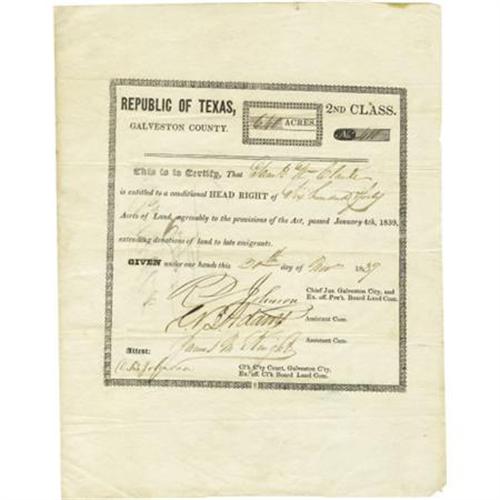 <B>Texas Second Class Head Right Grant of Land Galveston County</B></I> Signed "<I>R.D. Johnson</B></I>" as President, "<I>C.B. Adams</B></I>" and "<I>James M. Knight</B></I>" as Assistant Commissioners, and "<I>O.D. Johnson</B></I>" as Clerk of the County Court, one page, 7.5" x 9.5". Galveston, November 20, 1839. [Galveston. Commercial Intelligencer. Samuel Bangs, printer. 1839.] Partly printed, completed in manuscript, "<I>This is to Certify, That Saml W. Clarke is entitled to a conditional Head Right of Six hundred forty Acres of Land, agreeably to the provisions of the Act, passed January 4th, 1839, extending donations of land to late emigrants.</B></I>" <BR><BR>Second Class Head Rights were issued to every "free white person" who arrived in Texas between independence, March 2, 1836, and October 1, 1837, and were referred to as "late emigrants." Heads of families received 1,280 acres, while single men received 640 acres. Galveston County was formed in 1838 from Harrisburg, Liberty, and Brazoria counties and organized in 1839.<B> </B></I> <B>Robert Dabney Johnson</B></I> moved to Texas in 1837 and settled at Galveston. He was appointed notary public for Galveston on November 13, 1838. When the county was organized in 1839, he became county judge. Johnson also served as Chief Justice of Galveston City. In 1842, he was appointed Postmaster of Galveston. <B>C.B. Adams</B></I> was Justice of the Peace for Galveston County. Light show-through from docket on verso. Fine condition. <I>From the collection of Darrel Brown.</B></I><BR><BR><B>Reference: </B></I>Not in Streeter, Spell or Jenkins. Identifiable as a Bangs imprint by the use of seven different typefaces within the body of the document (Michael D. Heaston, Cat. 40-49). <BR><BR><b>Shipping:</b> Flat Material, Small (<a target="_blank" href="http://www.heritageauctions.com/common/shipping.php">view shipping information</a>)