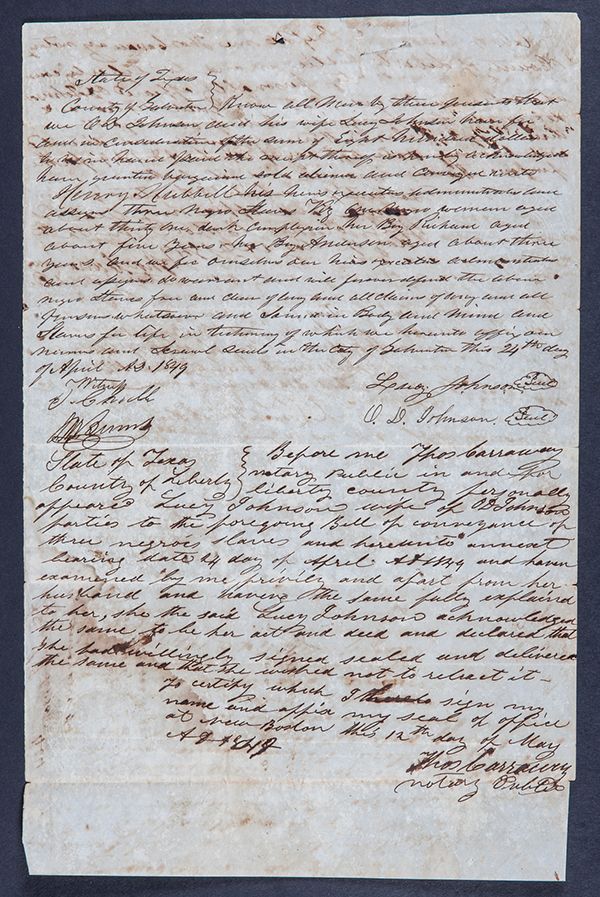[texas] Slave Bill of Sale, 1849. Manuscript bill of sale datelined Galveston, 24 April 1849, 8 x 11 in., by which O.D. Johnson and his wife, Lucy Johnson, sell "one negro woman aged about thirty one, dark complexion, her Boy Richard aged about five years, her Boy Anderson aged about three years," for the sum of $800. Two notary public sign, one for the husband and one for the wife. Some ink erosion and toning. Most slaves in Texas came with their owners from older slave states. The 1850 Texas census reported that slaves made up 27.4% of the population.