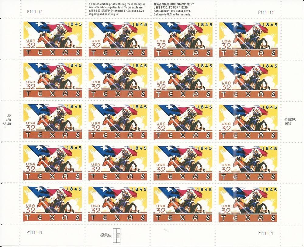 U.S. #2968, 1995 32¢ Texas Statehood Sheet of 20 Stamps