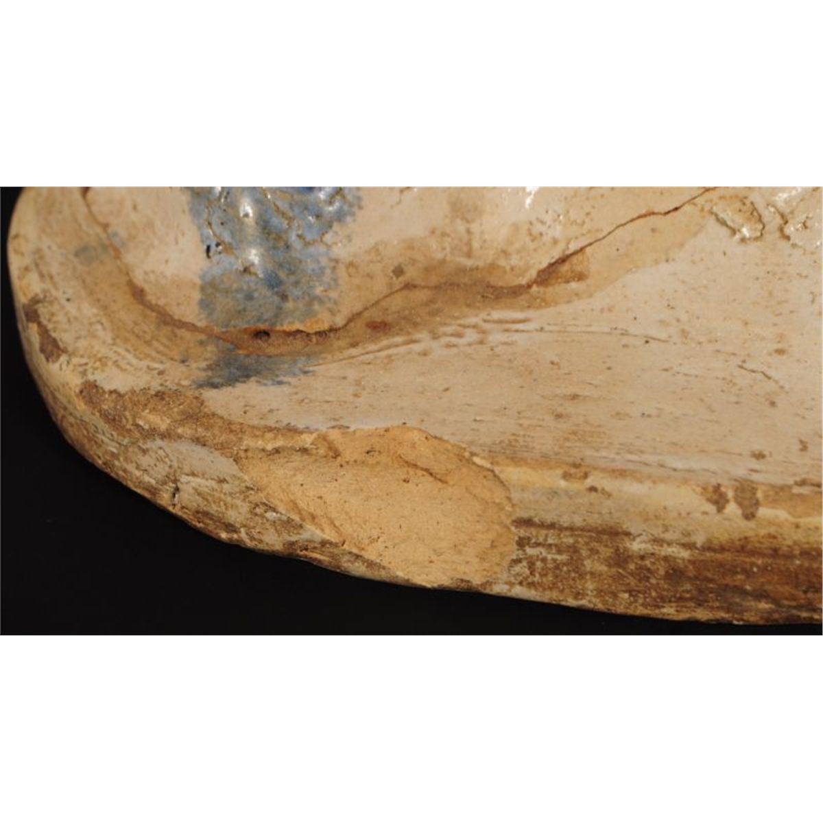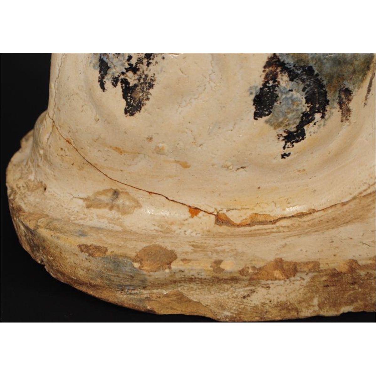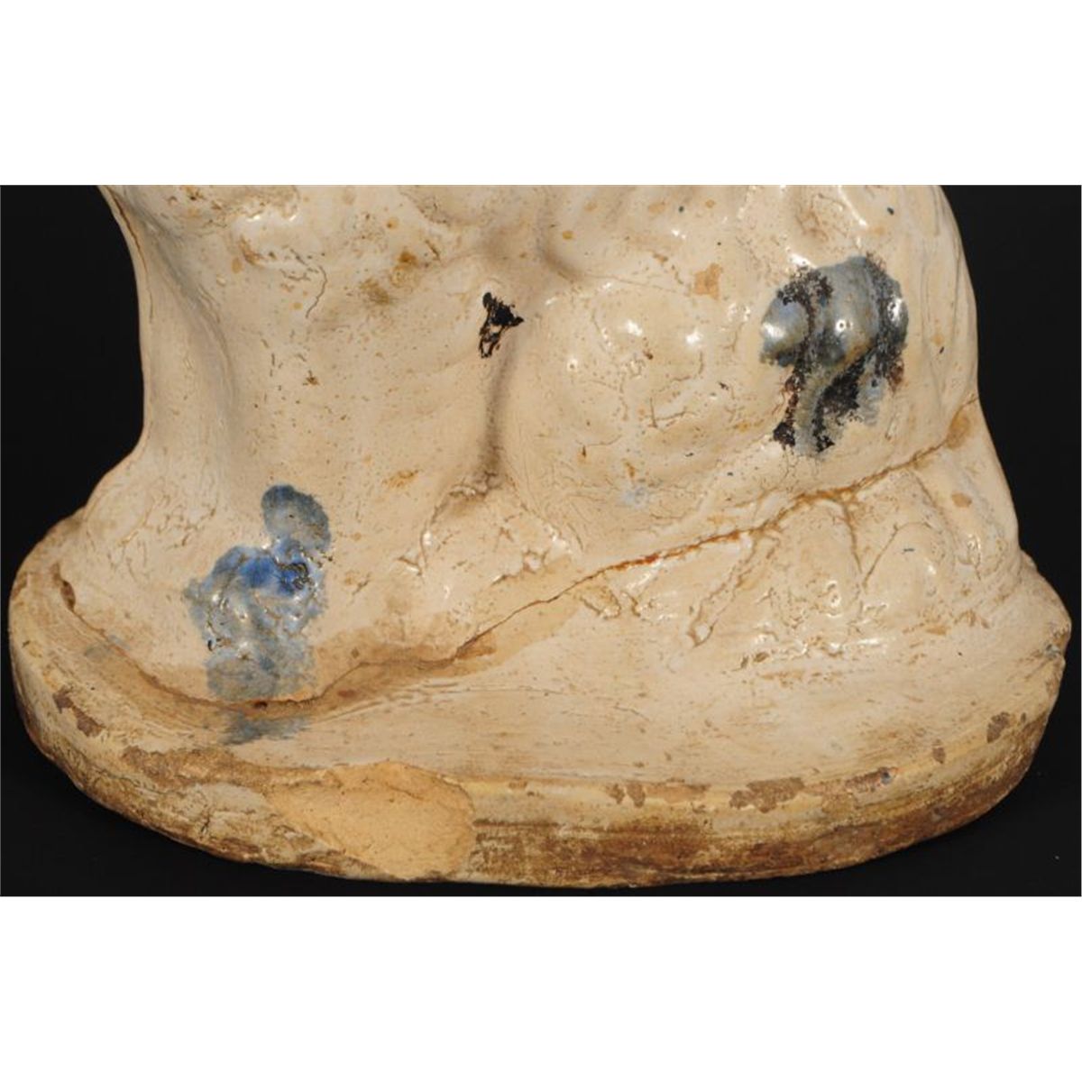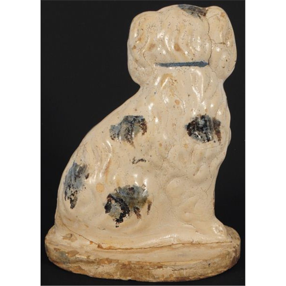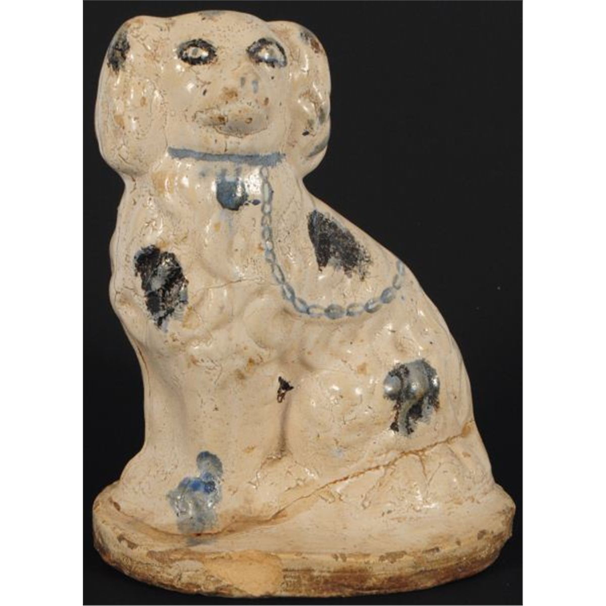 Spaniel Doorstop. Bristol glaze with blue sponge decorations. East Texas origin. Hogue Pottery, Winfield and Mt. Pleasant, Texas Normal wear to the back. Cobalt blue decorations have been overpainted with black. Being sold “as found”. Circa 1920. Collected in East Texas in the late 70’s and early 80’s. Has been broken and reglued at the base.