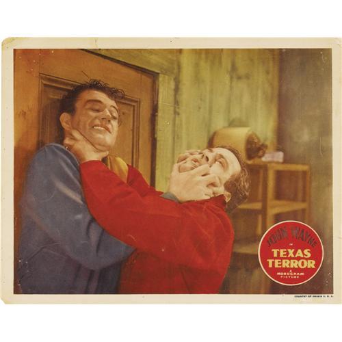 <B>Texas Terror (Monogram, 1935).</B></I> Lobby Card (11" X 14"). Looks like the "Duke," John Wayne, has the ol' "face-crusher" hold on the baddie in this Monogram Western. It's really tough to find anything on this 1935 title. Wayne completists always find a hole where this title is supposed to be! The card has a chip off of the lower left corner and upper right corner. The upper right has been repaired by someone pasting on a small piece of card to support and replace the missing piece.There are also two other small pieces of card pasted to the back of the right edge where minor chips of the card's borders were missing. There are some ten-plus tiny pinholes within the image and several more in the border. Though the description makes this card sound bad, it really displays very well. Again, this is a tough John Wayne title to find lobbies for. Fine-. <BR><BR><b>Shipping:</b> Flat Material, Small (<a target="_blank" href="http://www.heritageauctions.com/common/shipping.php">view shipping information</a>)