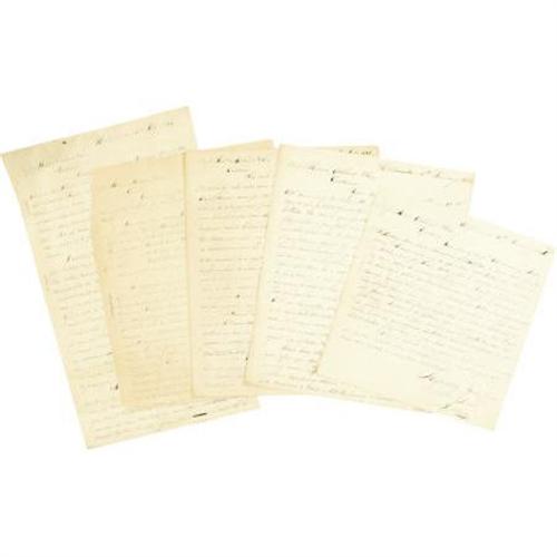 <B>[Texas]: </B></I><B><I>Two Brothers in Texas.</B></I></B></I> [Five Manuscript Letters by One Francis Wheatley To Philadelphia Merchant Richard Ashhurst Relating To William H. Patton, Hero of San Jacinto]. [Hopkinsville, Ky. October 1832 - February 1834]. Five letters totalling twelve pages of text. Four measure 8 x 10 inches, one 8 x 12 inches. Faint fold lines. Quite clean. Very good. An intriguing manuscript account of the Texas emigration of William H. Patton, hero of the battle of San Jacinto, and his brother, Alexander Patton. The letters are written by Francis Wheatley, a business associate of the Pattons from their hometown of Hopkinsville, Kentucky, to his Philadelphia business partner, Richard Ashhurst. Wheatley describes the Patton brothers' efforts to maintain various accounts established prior to their departure, and he includes a description of their westward emigration. William and Alexander Patton originally intended to head for Mississippi, but changed course for Texas, a decision that would have a profound impact on Texas history. Settling in Brazoria County near a place called Marion in March 1832, the brothers enjoyed three prosperous years of trading. In 1835, with war brewing, William Patton enlisted in the Army of Texas, and commanded a company at the seige of Bexar. As a major, he led a company at the Battle of San Jacinto, distinguishing himself so well that Houston remanded Santa Anna into his custody and selected Patton as one of several commissioners to escort Santa Anna to Washington. An important archive of letters, rich with details regarding the early Texas activities of one of her lesser-known heroes.<I> </B></I><BR><BR><B>Reference: </B></I><I>Handbook of Texas</B></I> 5, pp.94-95.<BR><BR><b>Shipping:</b> Flat Material, Small (<a target="_blank" href="http://www.heritageauctions.com/common/shipping.php">view shipping information</a>)<BR><BR><B>Important notice:</