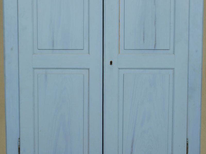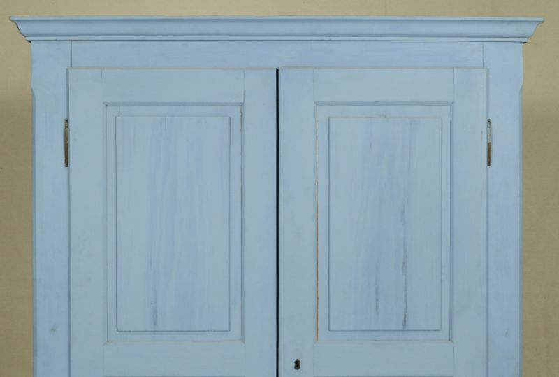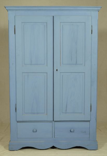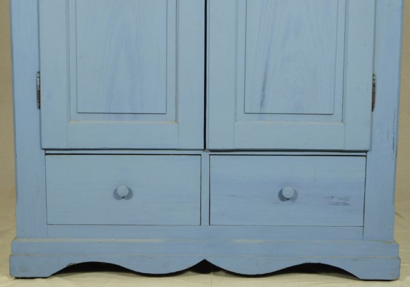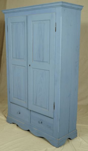 Longleaf pine, Chamfered Panels, Two drawer base, Contemporary blue paint over pine. Measures 78" x 48" x 18"