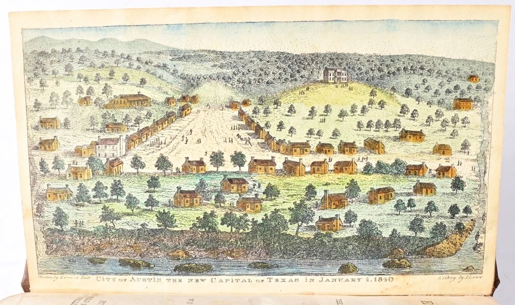 First edition "Texas in 1840" or the "Emigrant's Guide to the New Republic". Contains the first published image (this one hand-colored) of the "City of Austin, The New Capital of Texas, in January 1,1840". Published by William W. Allen, 1840.