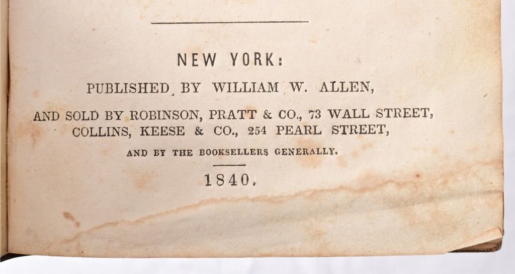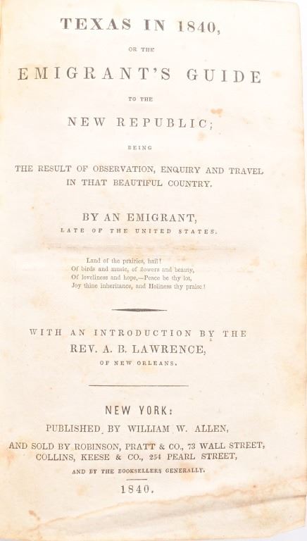 First edition "Texas in 1840" or the "Emigrant's Guide to the New Republic". Contains the first published image (this one hand-colored) of the "City of Austin, The New Capital of Texas, in January 1,1840". Published by William W. Allen, 1840.