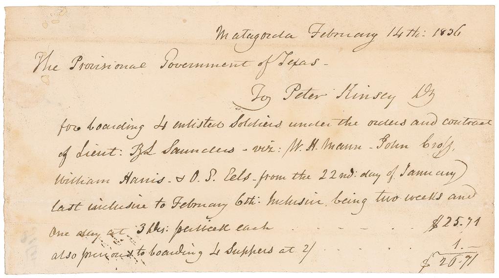 Manuscript DS, one page, 8 x 4.25, February 14, 1836. Document regarding the stay of four soldiers at the home of Peter Kinsey. In part: “For boarding 4 enlisted soldiers under the orders and contract of Lieut. R. L. Saunders—viz: W. H. Mann—John Cross, William Harris & O. G. Eels…inclusive being two weeks and one day at 3 Drs: per week each…$25.71.” In fine condition, with scattered light toning and soiling, intersecting folds, and a couple small spots of restoration to a few holes on reverse.