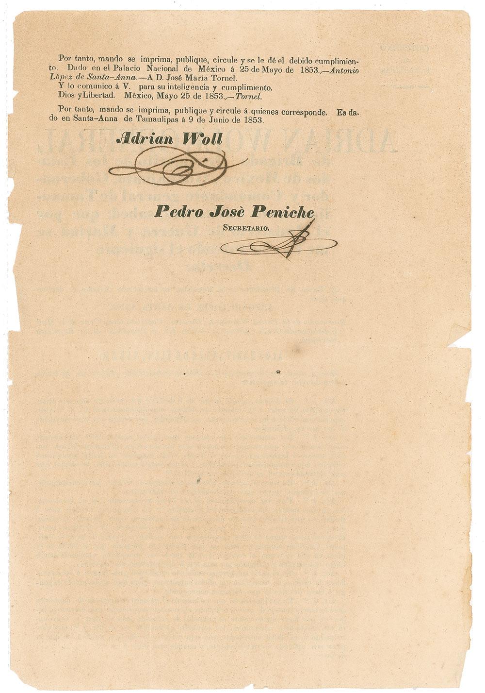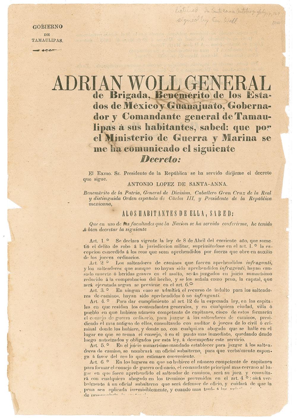 Rare printed broadside, in Spanish, one page, both sides, 8.5 x 12.5, signed “Adrian Woll,” dated May 25, 1853. Broadside is a decree on behalf of Antonio Lopez de Santa Anna, addressed "To the Inhabitants of this Country [Tamaulipas-a state in the northeast of Mexico]… ," followed by a series of articles regarding the treatment of criminals. In part: "The highway robbers that were apprehended red-handed and those that were not caught red-handed but caused death and heavy harm in the assault, will be judged very summarily… as penalty, it will be capital punishment to be dispensed and carried out in accordance with article 6… In no case recourse to mercy will be admitted for the highway robbers, whether caught red-handed or not…" With specific instructions for the carrying out of judgments by local officers. In very good condition, with chipping and paper loss to edges, a few folds and creases, and pencil notation to top edge of front. An important document attempting to quell the instability in the region after Mexico’s independence.