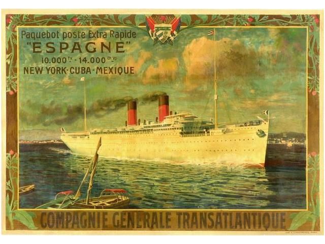 (Texto en Francés). COMPAGNIE GENERAL TRANSATLANTIQUE. PAQUEBOT POSTE ´ESPAGNE´. (1925 CA.). 83x118cm. (32,5x46,5in.). Litografía. B+. Algunas restauraciones. Entelado. BARCOS TRASATLÁNTICOS. Muy interesante con la bandera Cubana en el mástil.