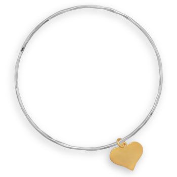 Textured sterling silver bangle bracelet with brushed 14 karat gold plated sterling silver heart charm. The bracelet is 1.5mm and the charm is 18mm. The bracelet diameter is 65mm. .925 Sterling Silver