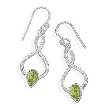 Sterling silver textured “figure “ design french wire earrings with a 6mm 9mm peridot. These earrings hang approximately 40mm. .925 Sterling Silver