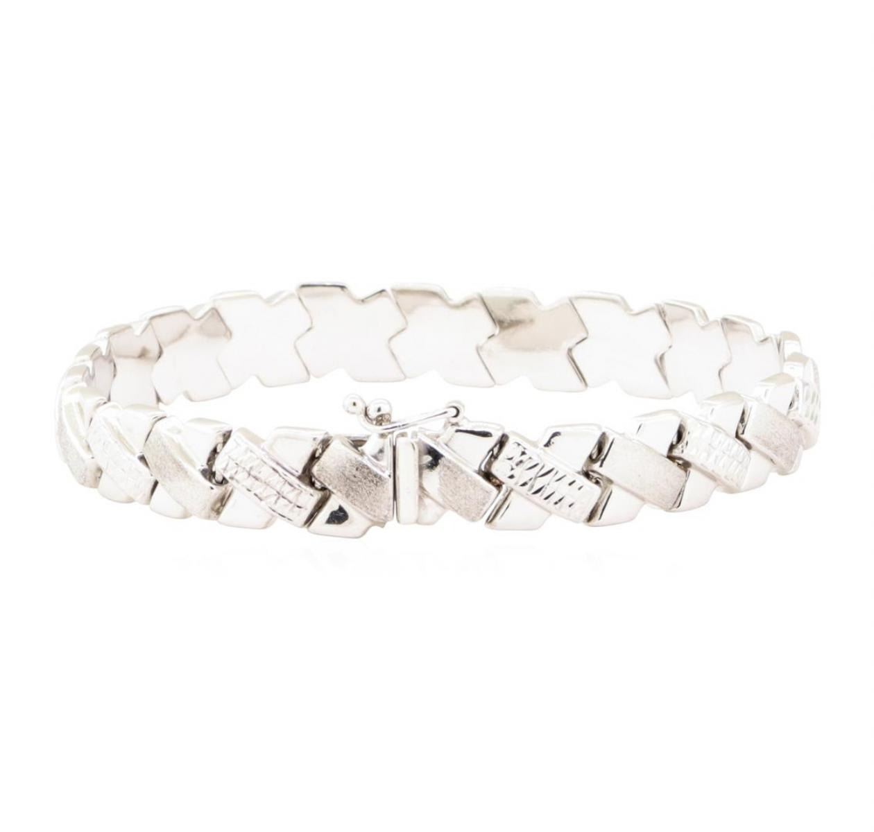One textured "X" motif bracelet measuring approximately seven inches in length and 8mm in width featuring: 14KT white gold weighing 10.1 grams.