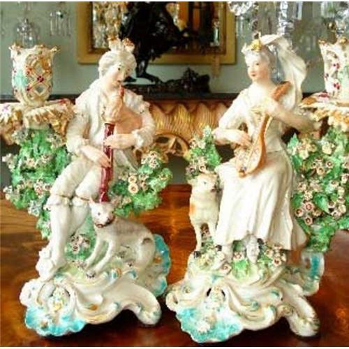 A VERY EARLY and VERY RARE Pair of Bow Porcelain Figural Candle holders, Circa 1745 to 1750, England. These beautiful candleholders depict a Shepherd and a Shepherdess, Sitting in a Flowery Grove. He plays the Bagpipes with Dog by his side while she plays a Lute with sheep at her feet. Very Beautiful Coloration and Excellent overall condition, with some early restoration to one of the sockets that holds the candles, (the sizes of candles have changed over the years, and should not be 'forced' into place) No repairs to the figures, their costumes or bases. Again, Remarkable condition, considering their age and the delicate nature of the pieces. These are believed to have been made by the famous modeler Angent Thibaut, a French immigrant to England who worked at both Bow and Derby Porcelain Factories, and who excelled in pastoral figures of this type. An identical Pair is on display at the Victoria and Albert Museum in London, as part of their permanent collection. They are labeled as being by "Thibaut" and labeled as having 'extensive restoration' The Pair offered here is almost perfect, with the mention of the repaired socket. These items will be shipped in a special crate and box, with Full insurance and Signature required upon receipt.