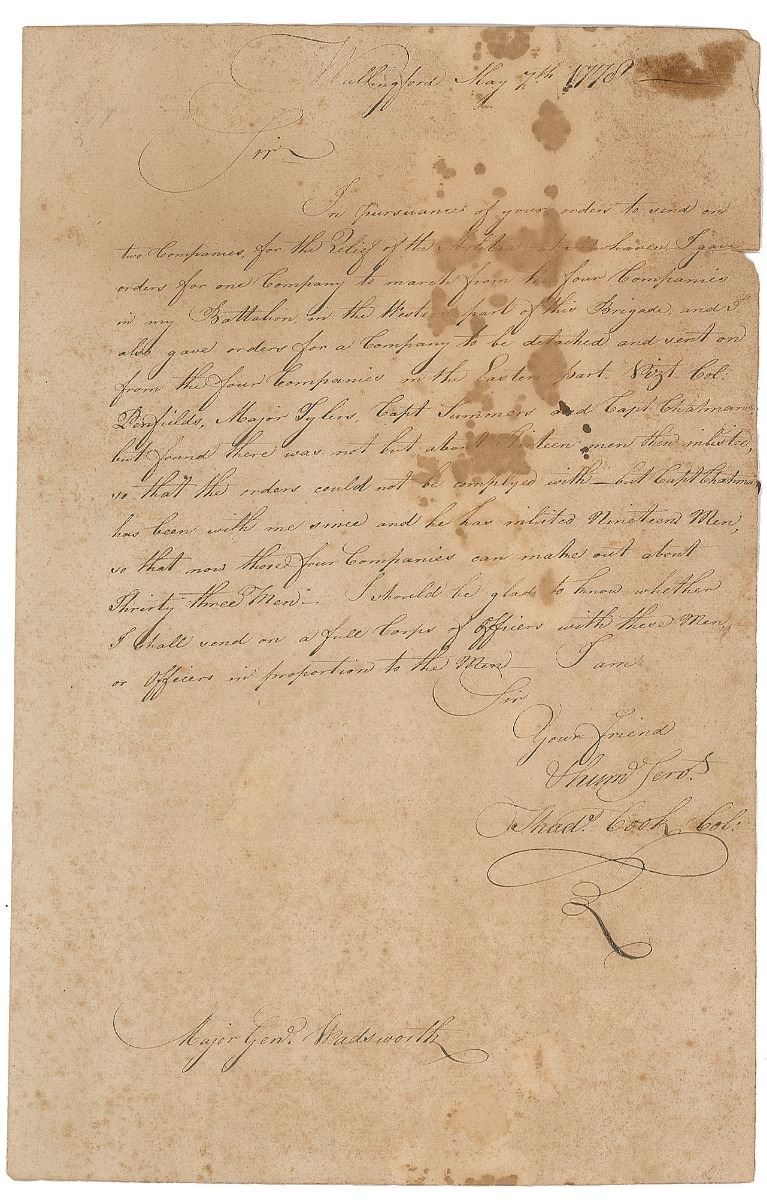 Extremely scarce Revolutionary War–dated ALS signed “Thad’s Cook Col.,” one page, 8 x 12.5, May 7, 1778. Letter to Major General Wadsworth in Durham. In part: “In pursuance of your order to send on two Companies, for the Relief of the Militia…I gave orders for one Company to march from the four Companies in my Battalion, on the Western part of this Brigade, and I also gave orders for a Company to be detached and sent on from the four Companies on the Eastern part. Vizt. Col. Penfields, Major Tylers, Capt. Summers and Capt. Chatmans but found there was not but about Thirteen men then inlisted, so that the orders could not be complyed with—but Capt. Chatman has been with me since and he has inlisted Nineteen Men, so that now those four Companies can make out about Thirty-three Men. I should be glad to know whether I shall send on a full Corps of Officers with these Men or Officers in proportion to the Men.” In very good condition, with edge chipping, light overall foxing, and staining affecting a few words but not readability.