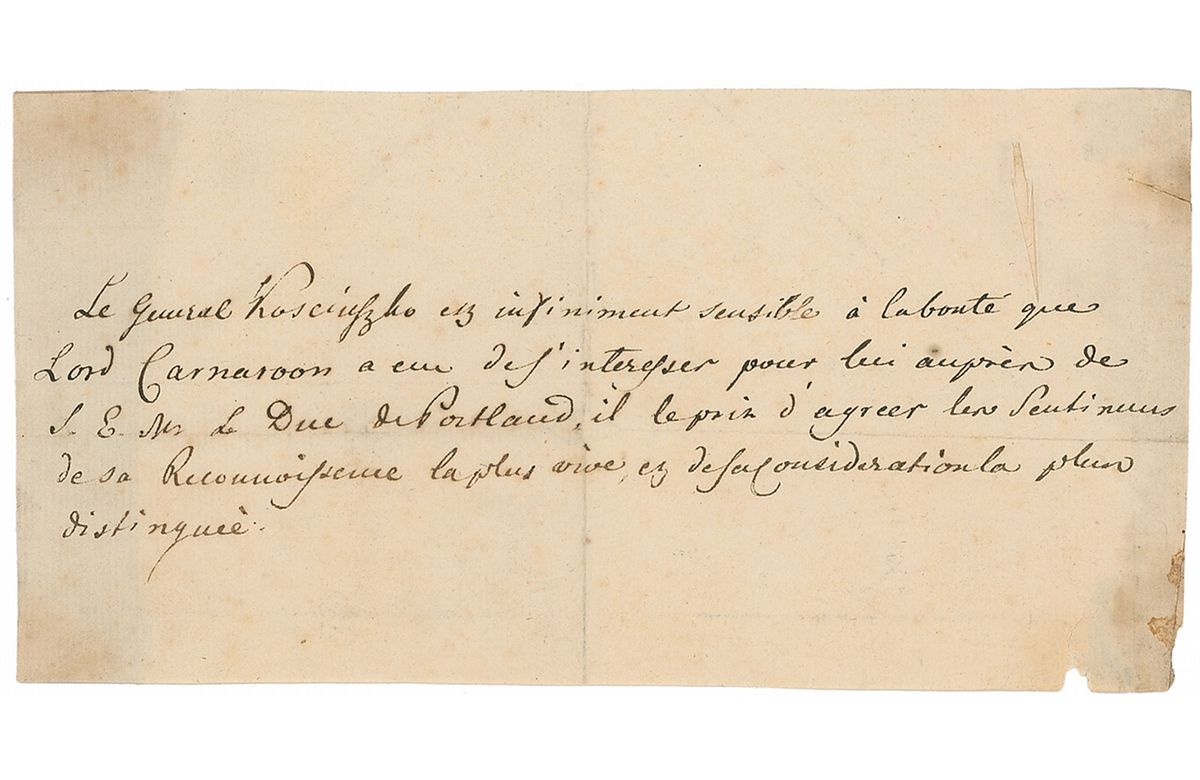 Supreme Commander of the National Armed force of Poland (1746-1817) he led the 1794 Kosciuszko Uprising against Imperial Russia and the Kingdom of Prussia as Supreme Commander of the National Armed Force. Rare third-person ALS in French, signed in the text “Le General Kosciuszko,” one page, 7 x 3.5, no date. In full (translated): “General Kosciuszko is extremely sensitive to Lord Carnarvon’s kindness for having approached Lord S.E.…Duke of Portland on his behalf. He is asking him to please accept his most profound gratitude and esteem.” Central vertical fold, circular toning to corner tips from mounting remnants on reverse, a few creases, and a small tear and area of paper loss to bottom edge, otherwise fine condition.