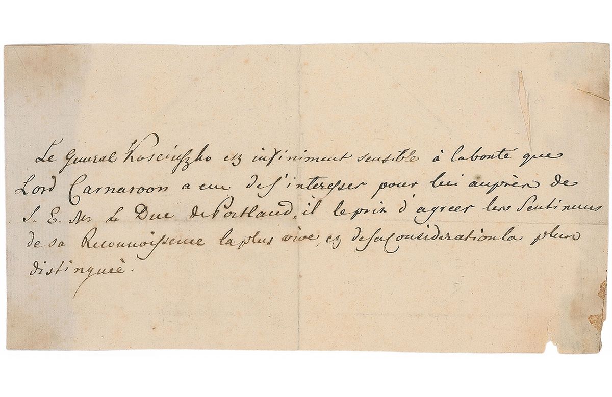 Polish military engineer and a military leader (1746–1817) who became a national hero in Poland, Belarus, and the United States. Rare third-person ALS in French, signed in the text “Le General Kosciuszko,” one page, 7 x 3.5, no date. In full (translated): “General Kosciuszko is extremely sensitive to Lord Carnarvon’s kindness for having approached Lord S.E.…Duke of Portland on his behalf. He is asking him to please accept his most profound gratitude and esteem.” Central vertical fold, circular toning to corner tips from mounting remnants on reverse, a few creases, and a small tear and area of paper loss to bottom edge, otherwise fine condition. Kosciuszko’s first military action came after he traveled to America in 1776 to participate in the Revolutionary War, as he was sympathetic to the cause. During his seven years in the Continental Army, he designed and oversaw the construction of innovative fortifications and also participated in combat, earning praise from Horatio Gates, Nathanael Greene, and George Washington. He then returned to Poland and organized his own rebellion, leading the 1794 Kosciuszko Uprising in a failed attempt to liberate Poland and Lithuania from Russian influence. A highly desirable piece from an important figure in world military history.