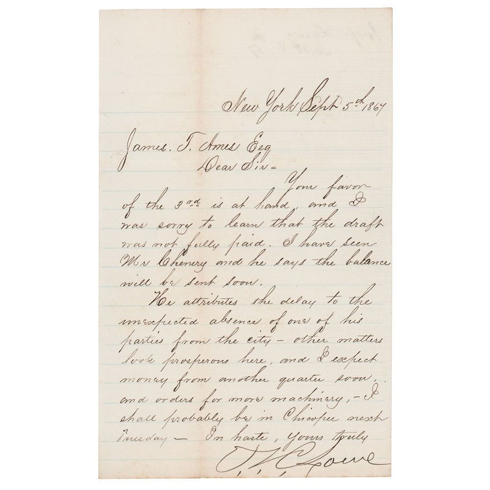 LS signed “T. S. C. Lowe,†one page, 5 x 8, September 5, 1867. Letter to manufacturer James T. Ames, in full: "Your favor of the 3rd is at hand, and I was sorry to learn that the draft was not fully paid. I have seen Mr. Chenery and he says the balance will be sent soon. He attributes the delay to the unexpected absence of one of his parties from the city—other matters look prosperous here, and I expect money from another quarter soon, and orders for more machinery,—I shall probably be in Chicopee next Tuesday." In fine condition, with light toning along the vertical fold.