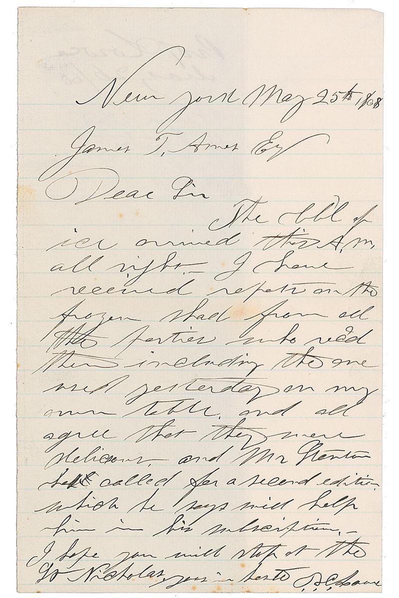 American balloonist (1832–1913) whose Union balloon corps tracked enemy movements, known as the father of military aerial reconnaissance in the United States. Rare ALS signed “T. S. C. Lowe,” one page, lightly-lined, 5 x 8, New York, May 25, 1868. Letter