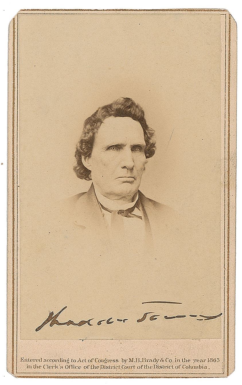 Original 2.5 x 4 carte-de-visite photo of Thaddeus Stevens, signed in fountain pen. Published by Brady's National Photographic Portrait Galleries of New York and Washington, D.C. In fine condition, with clipped corner tips.