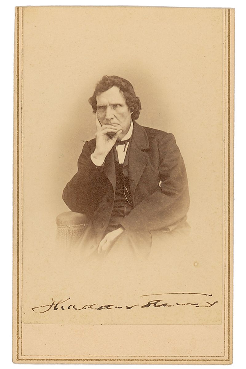 Representative from Pennsylvania who opposed fugitive slave laws and urged emancipation (1792–1868). Toward the end of his life, Stevens held more political power than any other man in the US, including President Andrew Johnson, whose impeachment proceedings Stevens led. Original 2.25 x 3.75 carte-de-visite half-length portrait of Stevens resting his chin on his hand as if deep in thought, signed at the bottom of the image in black ink. Published by Philp & Solomons of Washington from an Alexander Gardner image. In fine condition, with a trimmed top edge and slight irregular ink adhesion.