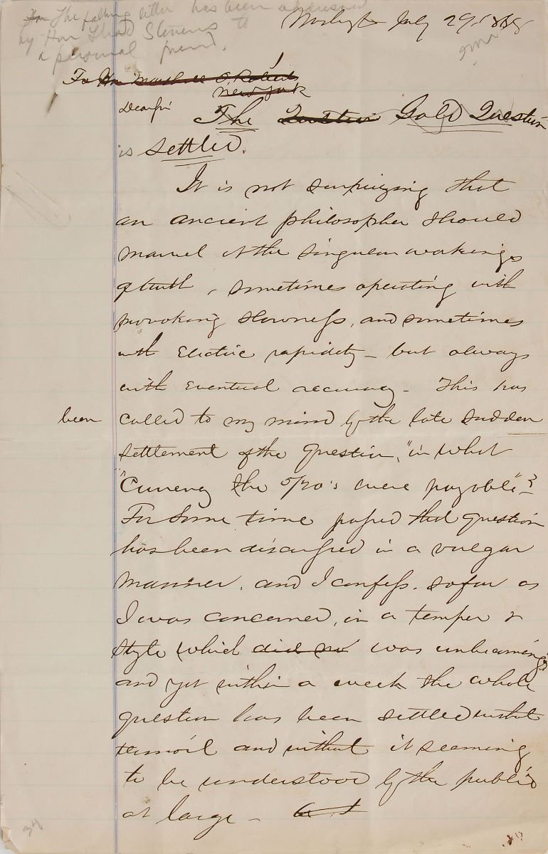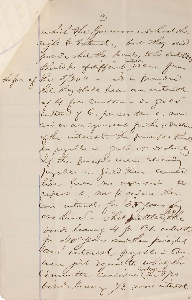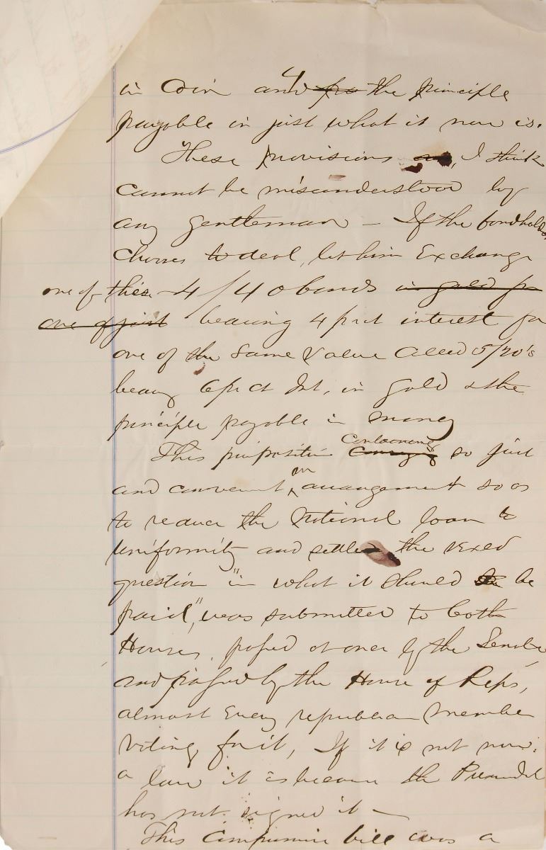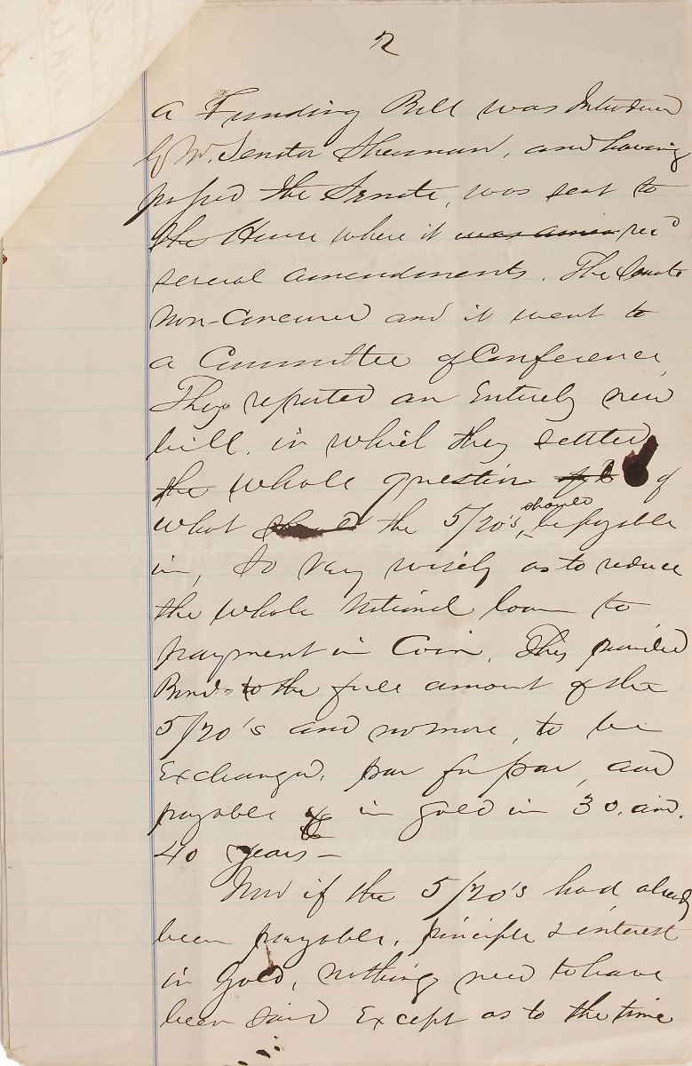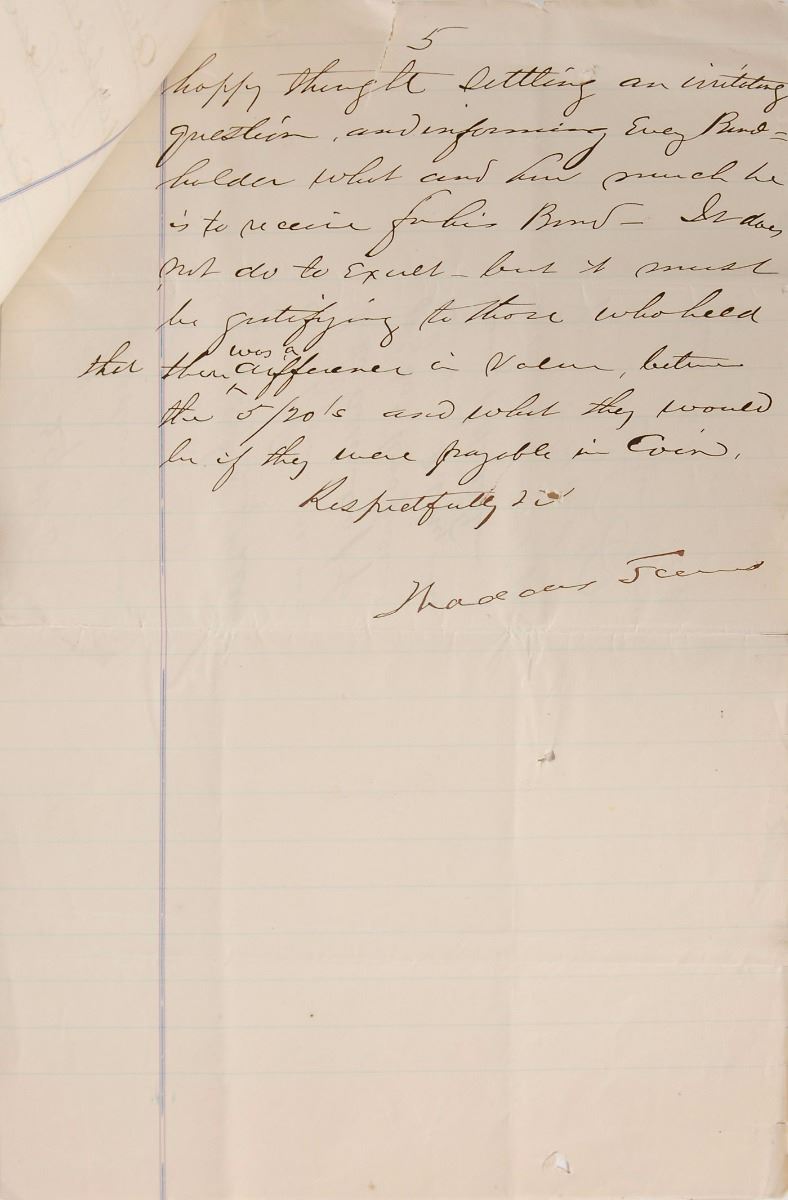 Representative from Pennsylvania (1792–1868) who opposed fugitive slave laws and urged emancipation. ALS, five pages, 8 x 12.5, July 29, 1868. Letter on the financial condition of the country which was published in the New York Times on July 31, 1868. In part: “The Gold Question is settled. It is not surprizing that an ancient philosopher should marvel at the singular workings of truth, sometimes operating with provoking slowness, and sometimes with electric rapidity, but always with eventual accuracy. This has been called to my mind by the late sudden settlement of the question, ‘in what currency the five-twenties were payable?’…A Funding bill was introduced by Mr. Senator Sherman, and, having passed the Senate, was sent to the House, where it received several amendments. The Senate non-concurred, and it went to a committee of conference. They reported an entirely new bill, in which they settle the whole question…This compromise bill was a happy thought, settling an irritating question, and informing every bondholder what and how much he is to receive for his bond. It does not do to exult, but it must be gratifying to those who held that there was a difference in value between the five-twenties and what they would be if they were payable in coin.” In fine condition, with a couple of small old tape repairs along fold splits.