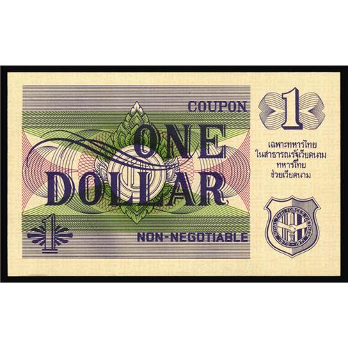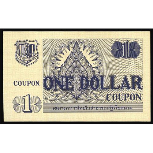 <B>Thai MPC Coupon Series 3 $1 Schwan 1025p Gem New.</B></I> Issued $1, $5, and $10 ($20s were not issued) Thai Series 3 coupons carry serial numbers. This $1 coupon is a remainder as it does not have a serial number. With the addition of serial numbers on these three denominations for this series, it is possible to keep track of these interesting pieces of history. There are only 16 issued $1 coupons in the Schwan census.
