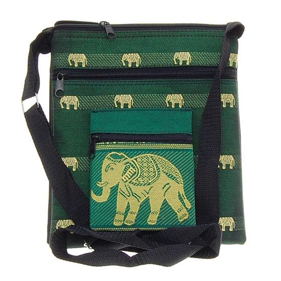 Excellent hand crafted piece using heavy Thai silk; zippered main compartment with 3 smaller zippered compartments outside; 9' body with shoulder strap; $85 retail