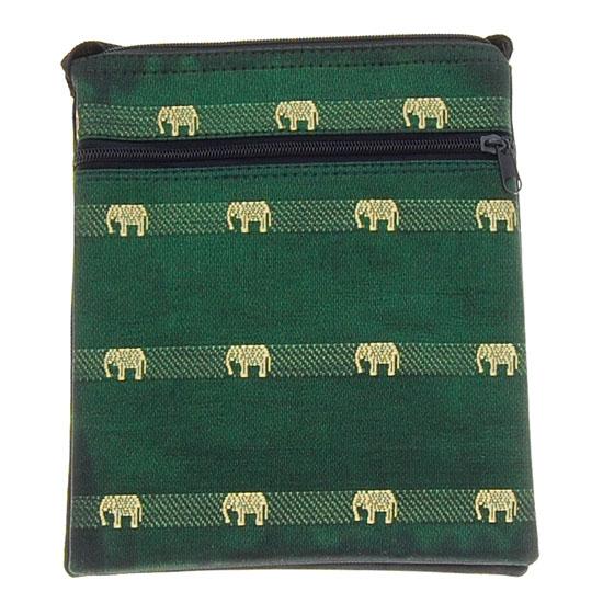 Excellent hand crafted piece using heavy Thai silk; zippered main compartment with 3 smaller zippered compartments outside; 9' body with shoulder strap; $85 retail
