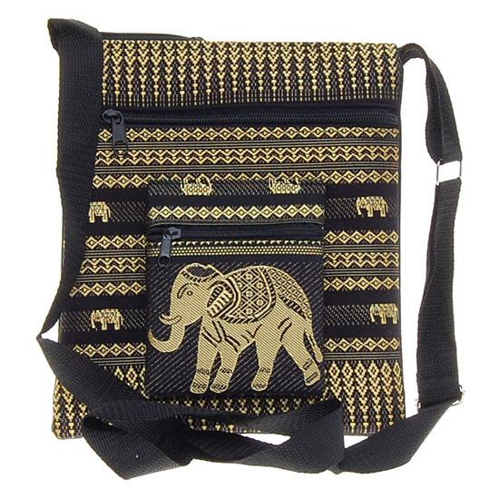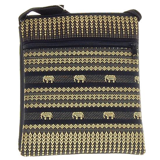 Excellent hand crafted piece using heavy Thai silk; zippered main compartment with 3 smaller zippered compartments outside; 9' body with shoulder strap; $85 retail