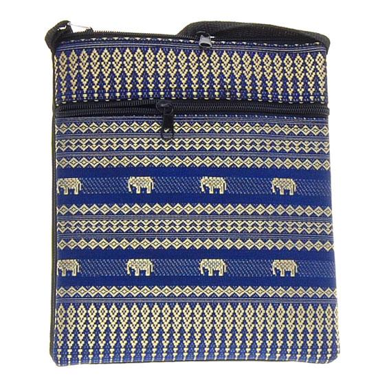 Excellent hand crafted piece using heavy Thai silk; zippered main compartment with 3 smaller zippered compartments outside; 9' body with shoulder strap; $85 retail