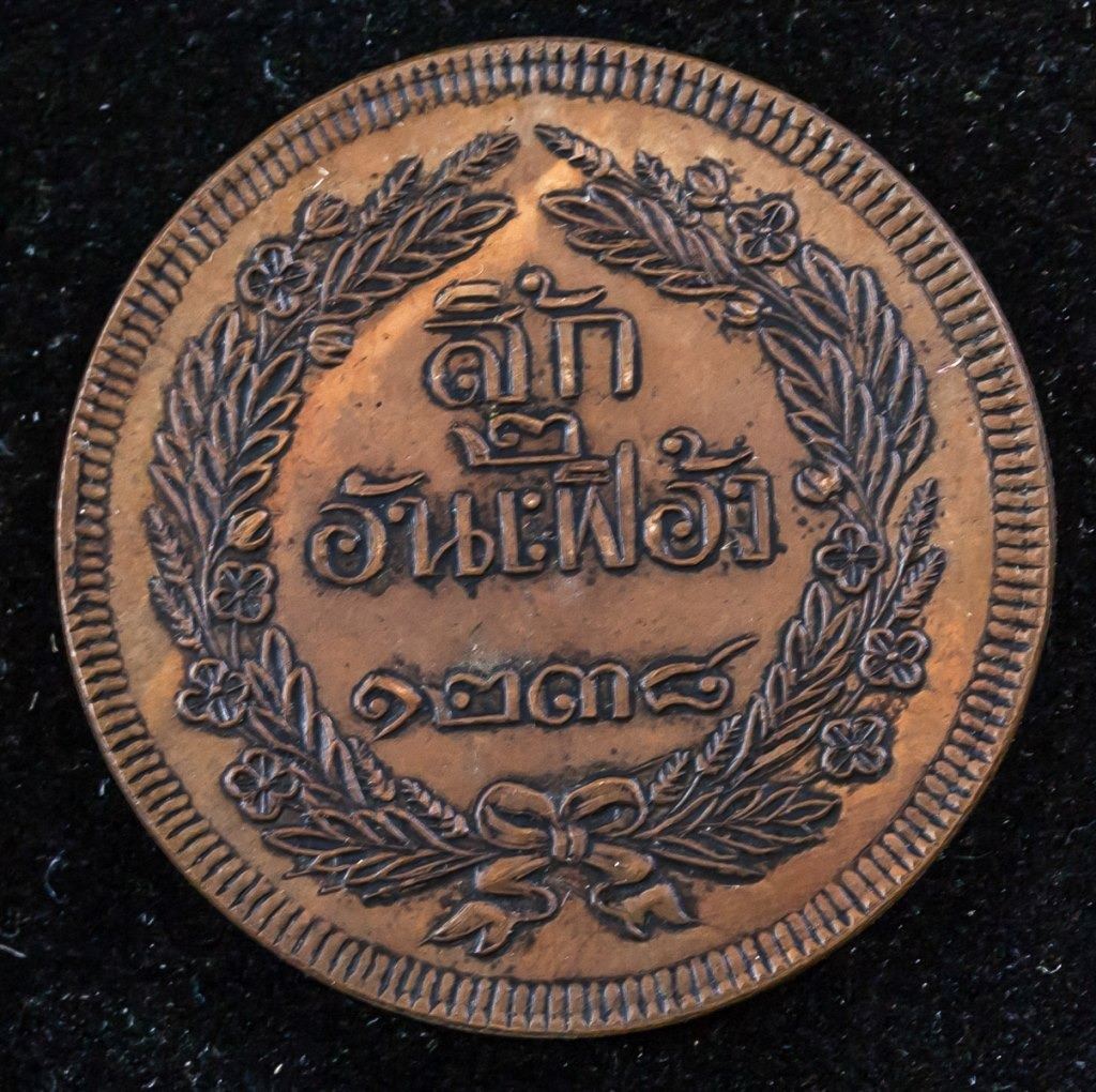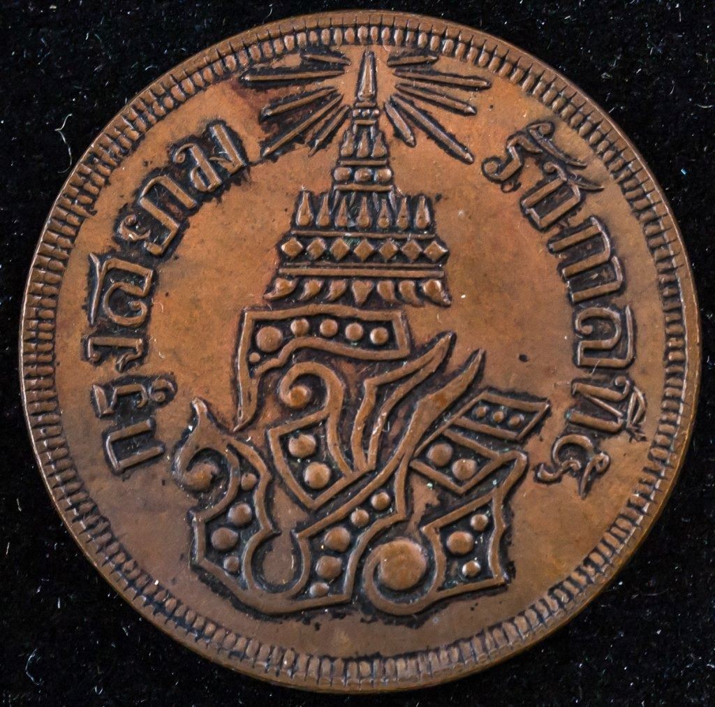 Thai coin. Obverse: Crowned monogram of King Rama V with 12 radius on top. Reverse: Inscription within Java Cassia (Cassia javanica) wreath. Both sides have lettering with Thai script. Diameter: 4 cm. 22 grams.