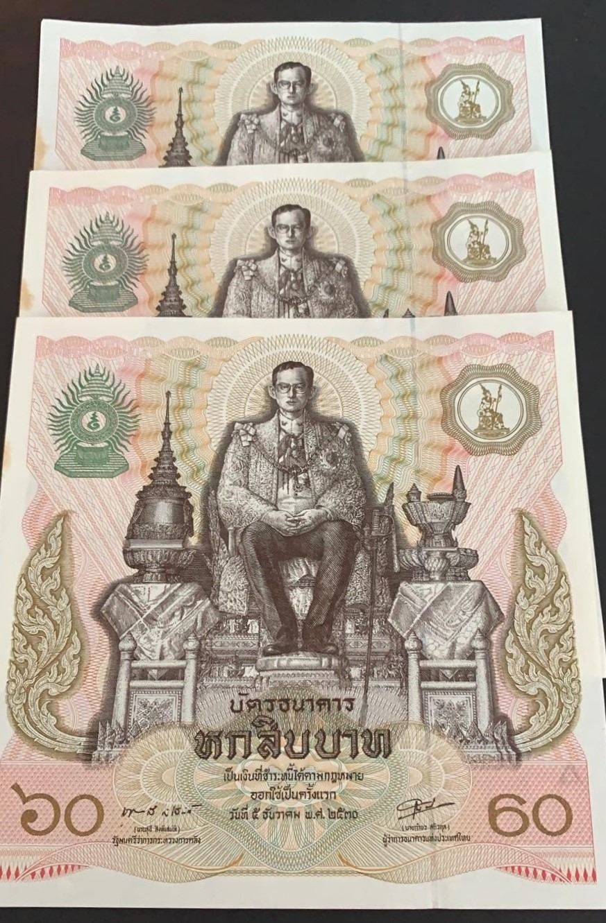 Thailand, 60 Baht, 1987, UNC, p93, (Total 3 consecutive banknotes)br/serial numbers: 5472903-5, commemorative issue, There is very little spotting on the left side of the banknotes.