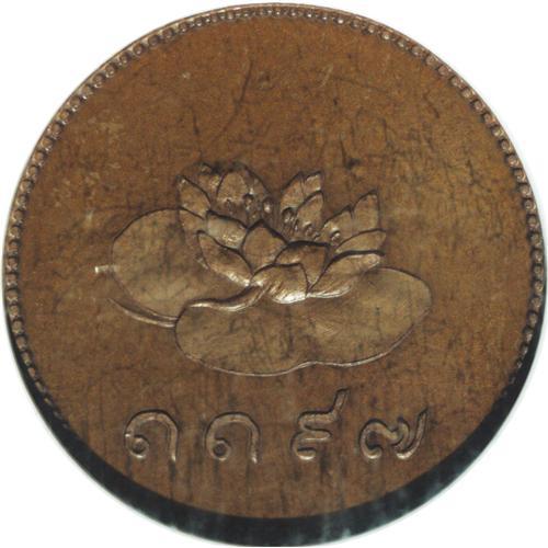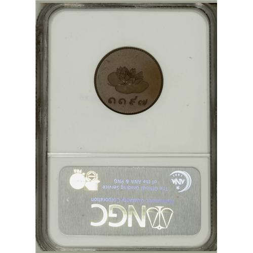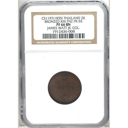 <B>A Proof Copper Pattern of the size and weight of 2 Keping CS 1197 (1835),</B></I> Lotus blossom with date below/Thai inscription-MUANG THAI with star above and below, KM-Tn2, Pridmore-55, bronzed Proof 66 Brown NGC. Superbly struck with pristine, mirror-like fields and no noticeable flaws. Extremely rare and even the example sold in the famous Irving Goodman Collection of Thailand coins was a cleaned XF. Included is the original paper wrapper and copper shell that came with many of these early proofs. Ex: James Watt, Jr. Collection.<BR><BR><b>Shipping:</b> Coins & Currency (<a target="_blank" href="http://www.heritageauctions.com/common/shipping.php">view shipping information</a>)