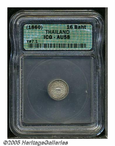<B>Rama IV 1/16 Baht (1860), </B></I>KM-Y7.1, AU58 ICG, a nice little coin with pleasing brown and gray toning.