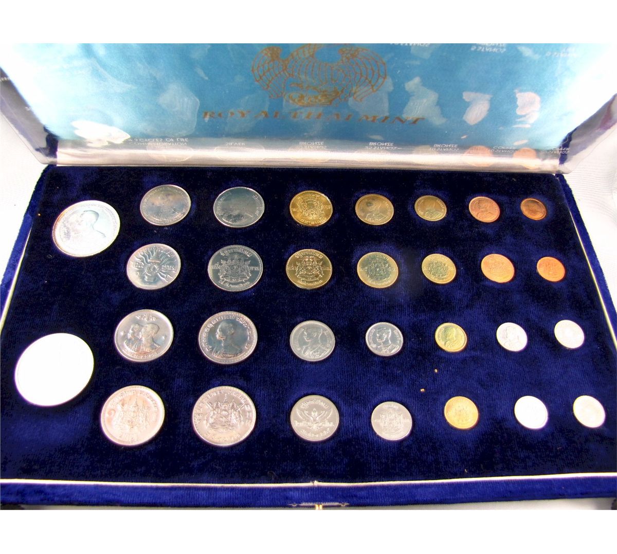 Thailand Royal Mint Lot; Includes 1963 Coin set in Blue velvet case, 30 different coins including 20 Baht Commerative Silver coin. Issued on December 1963 to celebrate the King's 36th birthday. Also includes 3 coin set(3) issue for the same purpose. Includes 2,411 oz silv.