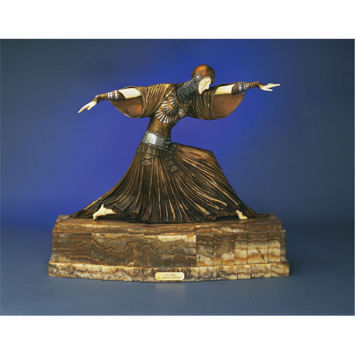 Bronze and ivory sculpture, Thais. Base signed, All ivory under lawful government permit, beautifully patina bronze, sits on a marble/onyx base. Some variations of marble and patina might occur. By Dimitri H Chiparus, 21.5"H x 23"L x 7"W