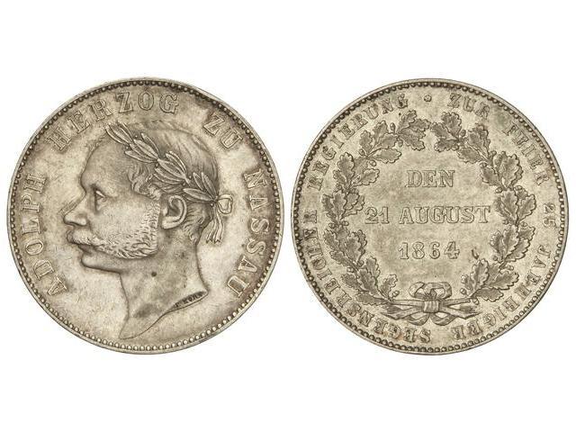 Thaler. 1864. ADOLFO I. NASSAU. AR. (Golpecitos). KM-80. MBC+.