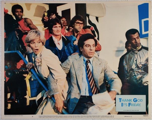 Thank God It's Friday (Columbia Pictures, 1978) lobby card. Comedy, Musical. Starring Valerie Landsburg, Terri Nunn, Chick Vennera, Donna Summer, Ray Vitte, Mark Lonow, Andrea Howard, Jeff Goldblum, Robin Menken, Debra Winger, John Friedrich, Paul Jabara, Mews Small. Directed by Robert Klane. Very light edge wear, very light creases. Near Mint. (11"x14").