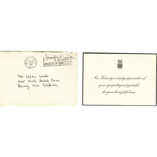 <B>Thank You Card From Jackie Kennedy to Clifton Webb.</B></I> A 5" x 3.5" card reading "Mrs. Kennedy is deeply appreciative of your sympathy and grateful for your thoughtfulness," sent by the First Lady to family friend/actor Clifton Webb not long after the assassination of John F. Kennedy. Also included is the original mailing envelope, postmarked January 15, 1964. In overall Very Fine to Excellent condition with Some mild wear to the envelope. <I>Accompanied by LOA from PSA/DNA.</B></I><BR><BR><b>Shipping:</b> Flat Material, Small (<a target="_blank" href="http://www.heritageauctions.com/common/shipping.php">view shipping information</a>)