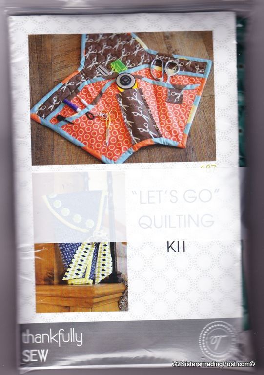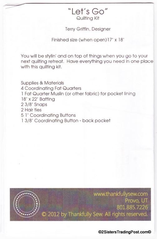 Let's Go' Quilting kit #187 designed by Terry Griffin for Thankfully Sew. Kit makes one quilting supply holder finished size opened is 17" x 18" NOTE: pattern is slightly bent from being packaged. MSRP $10.00