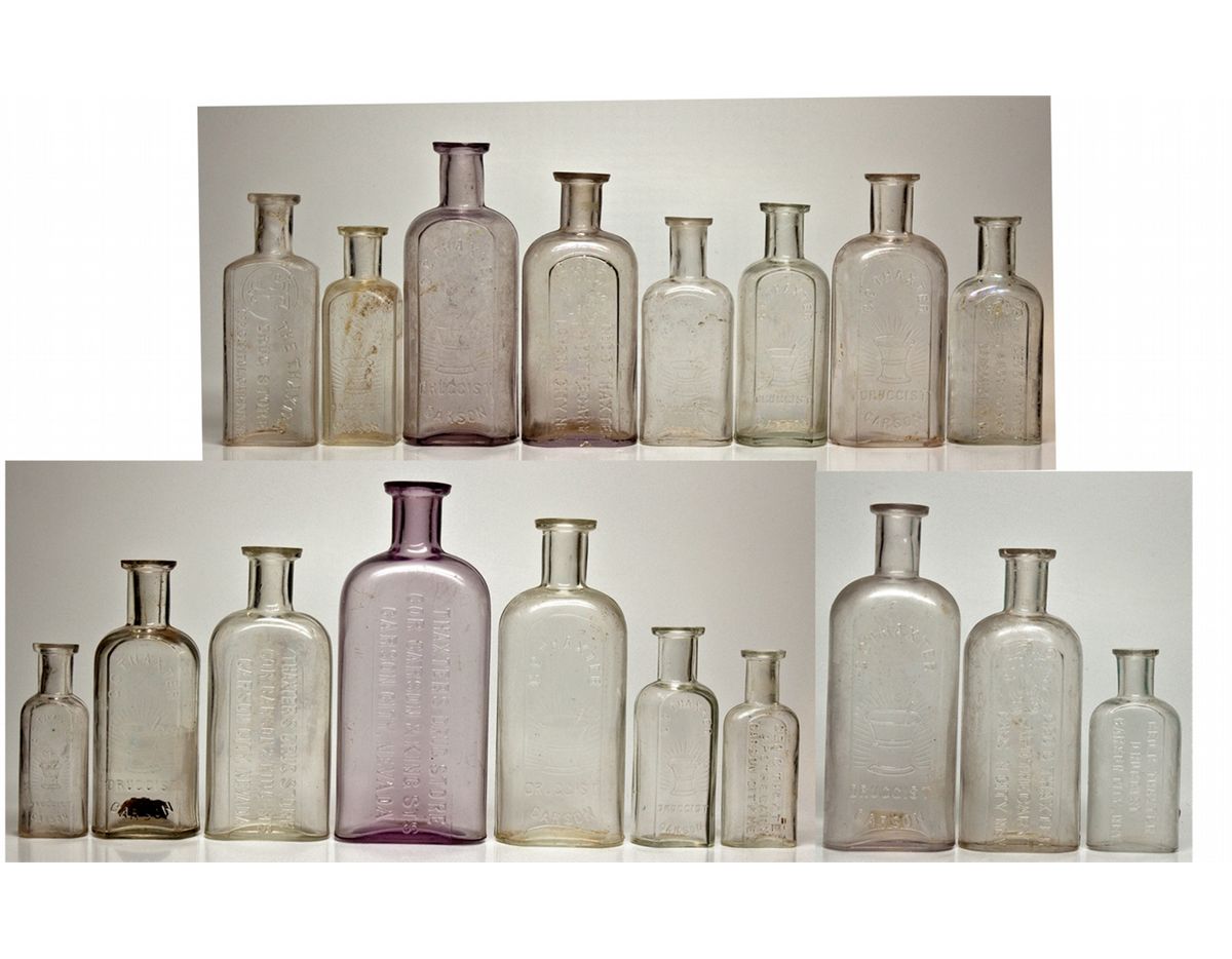 18 clear glass pieces from Thaxter's Drug Store in Carson City, Nev. George C. Thaxter had a drug store in Carson City for about 20 years. Thaxter bought out O. P. Willis' store on the northeast corner of Carson & King streets in 1878. His store was part of a long chain of ownership of the same business that lasted nearly 100 years. Lot includes four ovals, five rounds and one square-shaped with mortar-pestal logo, with slugs that read, G. C. THAXTER DRUGGIST CARSON: 1) 6.5", bottom embossed W. T. & CO. X, two tiny air bubbles on back, one on neck, no chips or cracks; 2) 5.75", bottom embossed W. T. & CO. Z, vent holes at shoulders, flaw inside lip, two tiny air bubbles on back, no chips or cracks; 3) 5", bottom embossed W. T. & Co. M, small chip on lip, air bubbles; 4) 4.25", bottom embossed W. T. & CO. S, flaws in mold process on left bottom and slug plate, seed bubbles on back and neck, no chips or cracks. Five rounds all have bottom embossed "W. T. & CO. PAT JAN 22 78, with a letter: 1) 5.5", sun purple, air bubbles, slight chip on lip intact, "D" on bottom; 2) 5", tiny air bubbles, cork inside, bottom letter unreadable; 3) 4.5", patina, "B" on bottom, what appear to be small open air bubbles or divots on neck; 4) 4", two chips on lip, "C" on bottom, 3 air bubbles; 5) 3.5", iridescence, large air bubble on back, small on slug plate, "G" on bottom, slight chip on lip. Square bottle is 4" tall, patina and embossed "W. T. & CO. I" on bottom, irregular shaped lip with inside chip. Three ovals, the oldest type, from 1878-, with old monogram flint on slug plates embossed GEO. C. THAXTER APOTHECARY CARSON CITY NEV: 1) 6", two chips on lip (one large), rough spot on base edge, small scratch to left of slug, opalized, "7" on bottom; 2) 5", large chip on slug plate base, chip and rough edges on lip, "10" on bottom; 3) 4.25", small chip on lip and flaw, "6" on bottom. There is one 4.5" square bottle with monogram "T", slug reads THE THAXTER DRUG STORE OPP. CAPITOL. CARSON, NEV, two bubbles on neck, one on right side, bottom reads "S-F C CO 122", tiny ding on neck, tiny open bubble on back. Last four bottles embossed in block letters: 1) 6.5", slug reads THAXTER'S DRUG STORE COR. CARSON & KING STS. CARSON CITY, NEVADA, sun purple, chip on lip, small scratch on back, two air bubbles; 2) 5.25", slug reads THAXTER'S DRUG STORE COR. CARSON & KING STS. CARSON CITY, NEVADA, no chips or cracks; 3) 4", slug reads GEO. C. THAXTER DRUGGIST CARSON CITY, NEV., large air bubble on right side, chip on lip, intact; 4) 3.5", slug reads GEO. C. THAXTER APOTHECARY CARSON CITY, NEV, bottom embossed, "W T & CO E", sick, slight lip chip. - Jacobitz Collection -59608