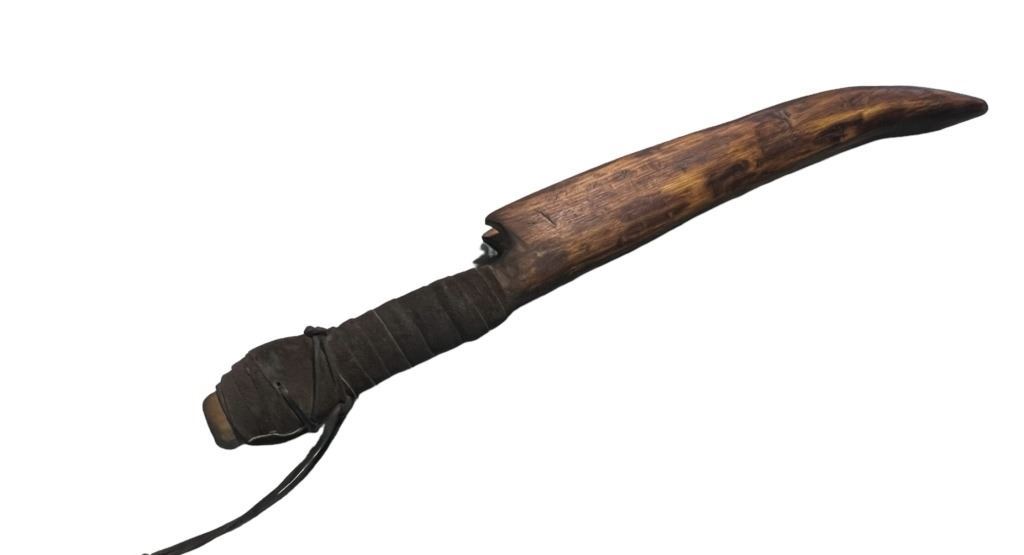 Made of wood with lether wrapped handle, with a metal spike in the end to hold the spear.