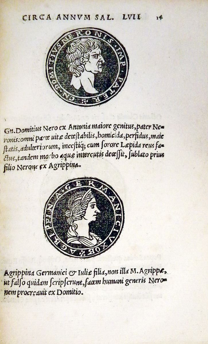 Huttich, Joannes. IMPERATORUM ROMANORUM LIBELLUS. UNÀ CUM IMAGINIBUS, AD VIVAM EFFIGIEM EXPRESSIS. CUM PRIVILEGIO CAESAREO. Argentinae (Strasbourg): Wolfgangus Caephalius, 1525 (from the colophon). First edition. 8vo [16.5 by 11 cm], modern vellum and illustrated boards; hand-lettered spine. 100 leaves [200 pages], numbering erratic as published, but complete, including the colophon leaf and final leaf with ornate printer's woodcut device on verso; historiated woodcut title border and vignette; most pages with one or two attractive woodcuts of Roman coins or coins of the Holy Roman Empire in white on a black background. ... Binding a bit rubbed. Very good or better. See catalogue for full description.