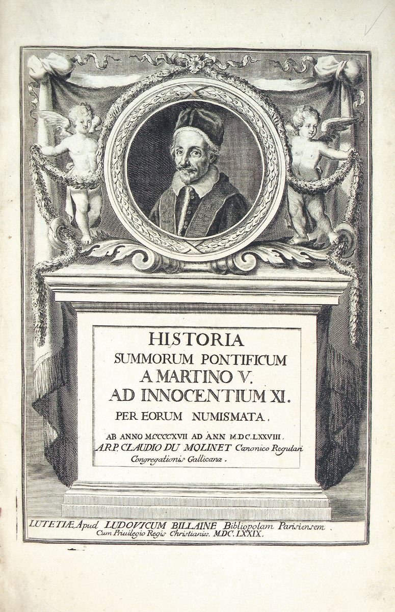Du Molinet, Claudius. HISTORIA SUMMORUM PONTIFICUM... Lutetiae: Apud Ludovicum Billaine, 1679. First edition. Folio [37.5 by 25.5 cm], contemporary full brown calf; spine with six raised bands, richly decorated in gilt; second spine panel lettered in gilt. Half-title; unsigned but superbly engraved title incorporating a medallion portrait of Innocent XI; 8 printed leaves; 226, (2) pages; finely engraved initials, headpieces and tailpieces; engraved size chart; numerous text engravings of medals, comprising 44 copper plates in all. Binding worn, with front board nearly detached. Very good. See catalogue for full description.