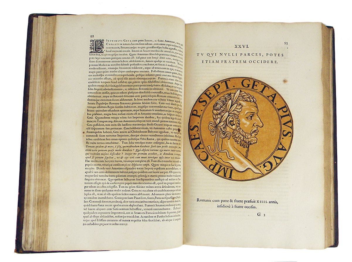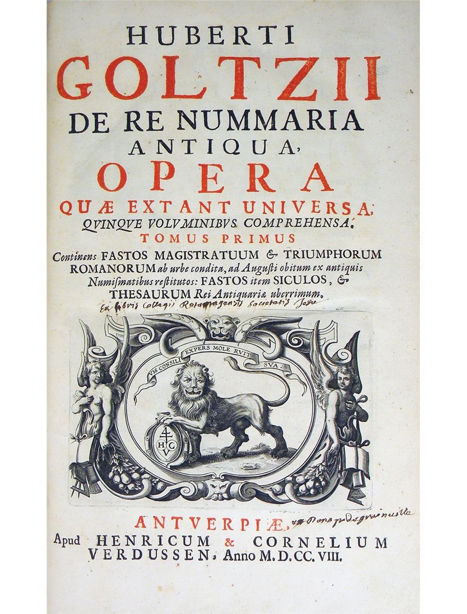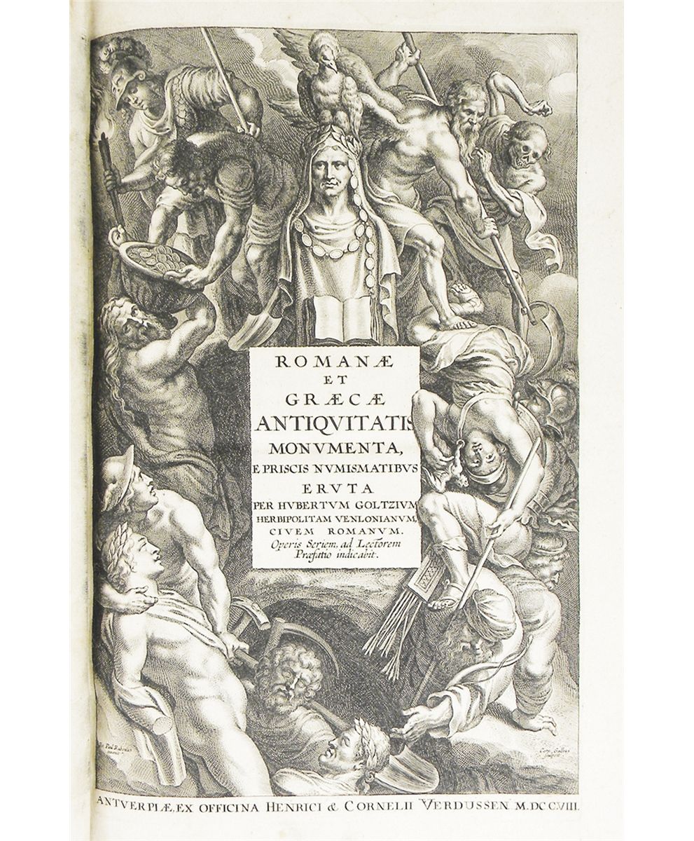 Goltzius, Hubertus. HUBERTI GOLTZII DE RE NUMMARIA ANTIQUA, OPERA QUAE EXTANT UNIVERSA, QUINQUE VOLUMINIBUS COMPREHENSA. TOMUS PRIMUS-QUINTUS. Antwerp: Hendrik Verdussen and Corneel Verdussen, 1708. Five volumes, complete. Folio [37 by 25 cm], contemporary matching full brown calf; spines with six raised bands, gilt; two spine labels, gilt; remaining compartments richly decorated in gilt; board edges decorated in gilt. Vol. I: (20), 288, (48), (4) pages, 314 columns, (1) page; illustrated throughout; finely engraved frontispiece signed by Rubens; first title printed in red and black with engraved printer's device; finely engraved title; woodcut initials and tailpieces. Vol. II: (8), (2), 99, (1), (2), 38, (10), 78, (2) pages; 11 + 81 + 45 engraved plates; printed title with engraved printer's device; finely engraved frontispiece; woodcut initials and tailpieces. Vol. III: (2), (16), 326, (14) pages; 38 + 5 engraved plates; printed title with engraved printer's device; finely engraved frontispiece; woodcut initials and tailpieces. Vol. IV: (14), 326, (58), 96, (8) pages; 14 + 28 engraved plates; 2 engraved maps; printed title with engraved printer's device; finely engraved frontispiece; woodcut initials and tailpieces. Vol. V: xiv, (2), 423, (3) pages; illustrated throughout on 144 exceptional 17 cm diameter chiaroscuro woodcuts depicting ancient, medieval and modern coins [plus 16 blank medallion forms, as issued]; printed title with engraved printer's device; finely engraved allegorical title by Cornelius Galle; woodcut initials. Bindings a bit worn, with some cracking, though still sound and unbowed. Well-preserved, though with the usual offset discoloration from the tinted plates in the final volume. Very good or better. A noted Dutch scholar and engraver, Hubert Goltz was a major influence in the early evolution of numismatics. His series of five folio works on ancient Roman coins remained standard references for two centuries. [Online description truncated: see printed or PDF catalogue for full description.]