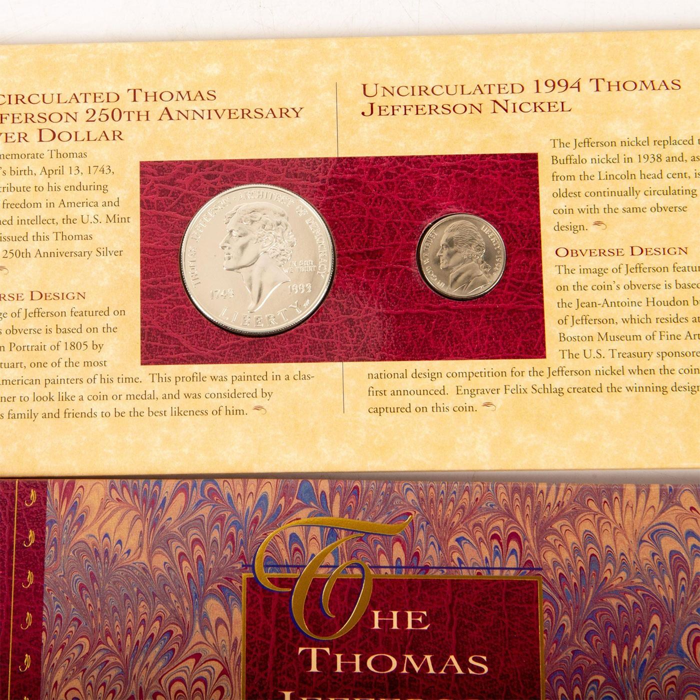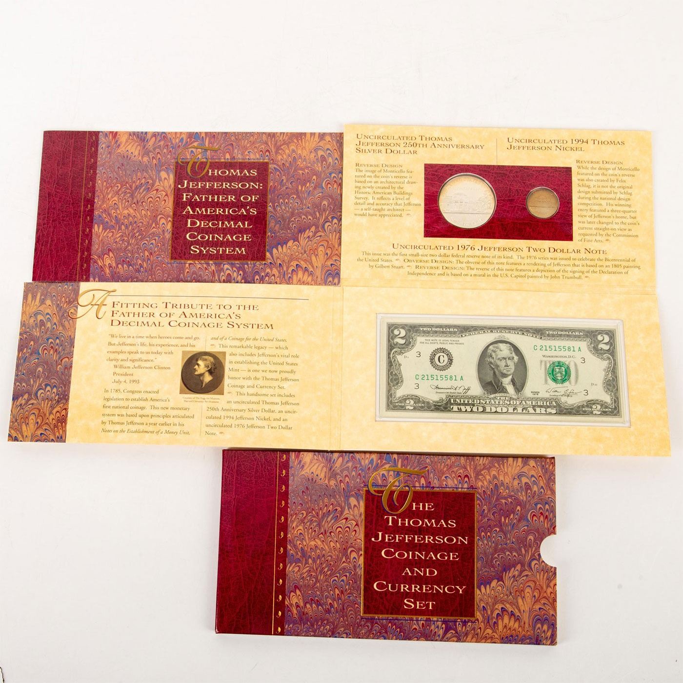 Thomas Jefferson:Father of America's decimal coinage system. This Thomas Jefferson coinage and currency set includes: 1 uncirculated Thomas Jefferson 250th anniversary silver dollar. 1 Uncirculated 1994 Thomas Jefferson nickel. 1 uncirculated 1976 Jefferson Two dollar note. Sealed. Contained in its original book and box. Condition as is. Coins and Currency, Numismatists