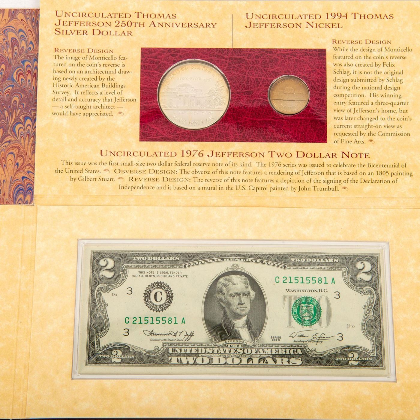 Thomas Jefferson:Father of America's decimal coinage system. This Thomas Jefferson coinage and currency set includes: 1 uncirculated Thomas Jefferson 250th anniversary silver dollar. 1 Uncirculated 1994 Thomas Jefferson nickel. 1 uncirculated 1976 Jefferson Two dollar note. Sealed. Contained in its original book and box. Condition as is. Coins and Currency, Numismatists
