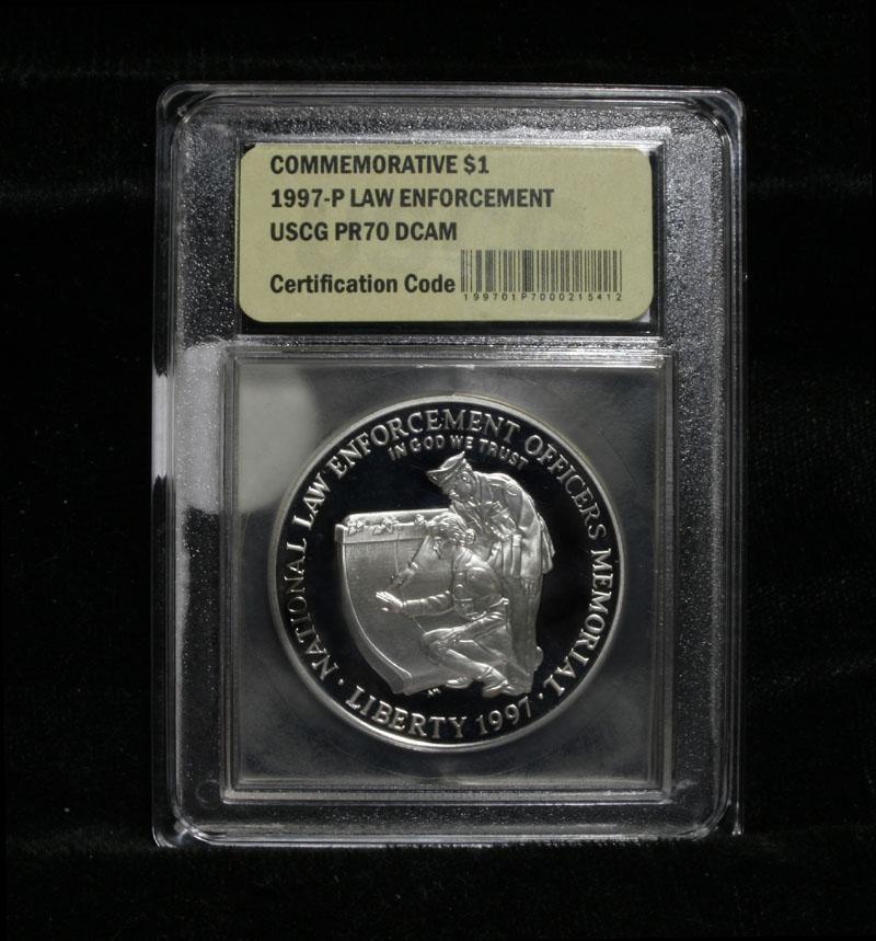 The 1997 National Law Enforcement Officers Memorial Silver Dollar was issued on the sixth anniversary of the dedication of the memorial, which honors more than 14,000 men and women who lost their lives in the line of duty. Encapsulated and graded PR70 DCAM by USCG PCGS lists PR70 as $1050. Estimated Value $300